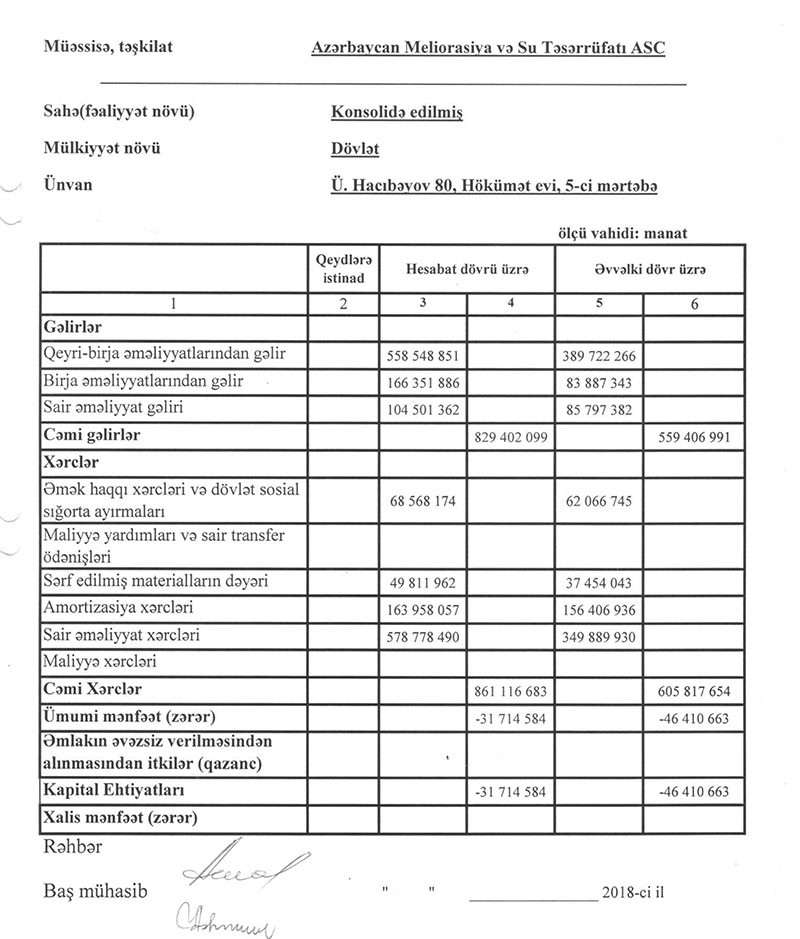 Dövlətə məxsus “Azərbaycan Meliorasiya və Su Təsərrüfatı” ASC 2018-ci ili 31 milyon 714 min manat xalis zərər ilə başa vurub. Bu, 2017-ci illə müqayisədə 31,6% azdır. ASC 2017-ci ili 46 milyon 411 min manat zərər ilə bağlamışdı.