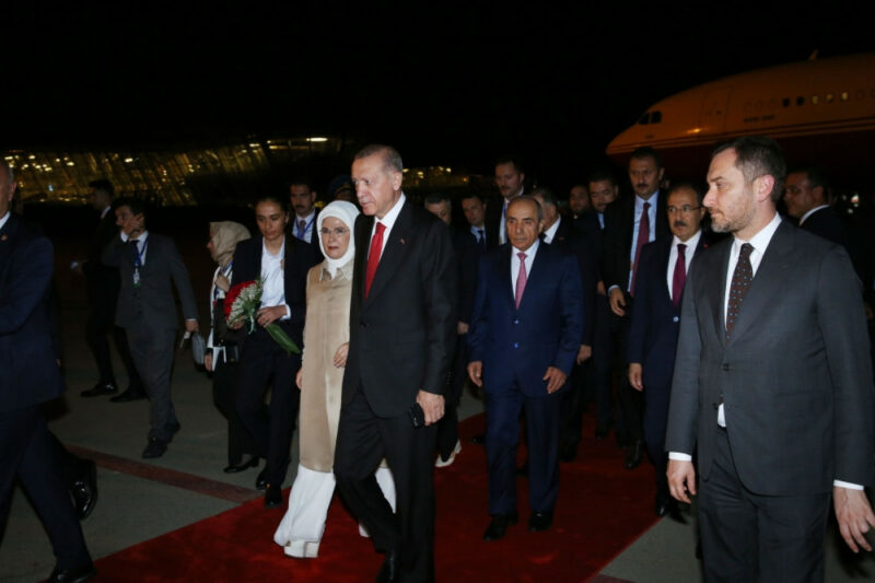 Türkiyə Prezidenti Rəcəb Tayyib Ərdoğanı və xanımı Əminə Ərdoğanı hava limanında Azərbaycan Respublikası Baş nazirinin birinci müavini Yaqub Eyyubov, xarici işlər nazirinin müavini Xələf Xələfov və digər rəsmi şəxslər qarşıladılar.