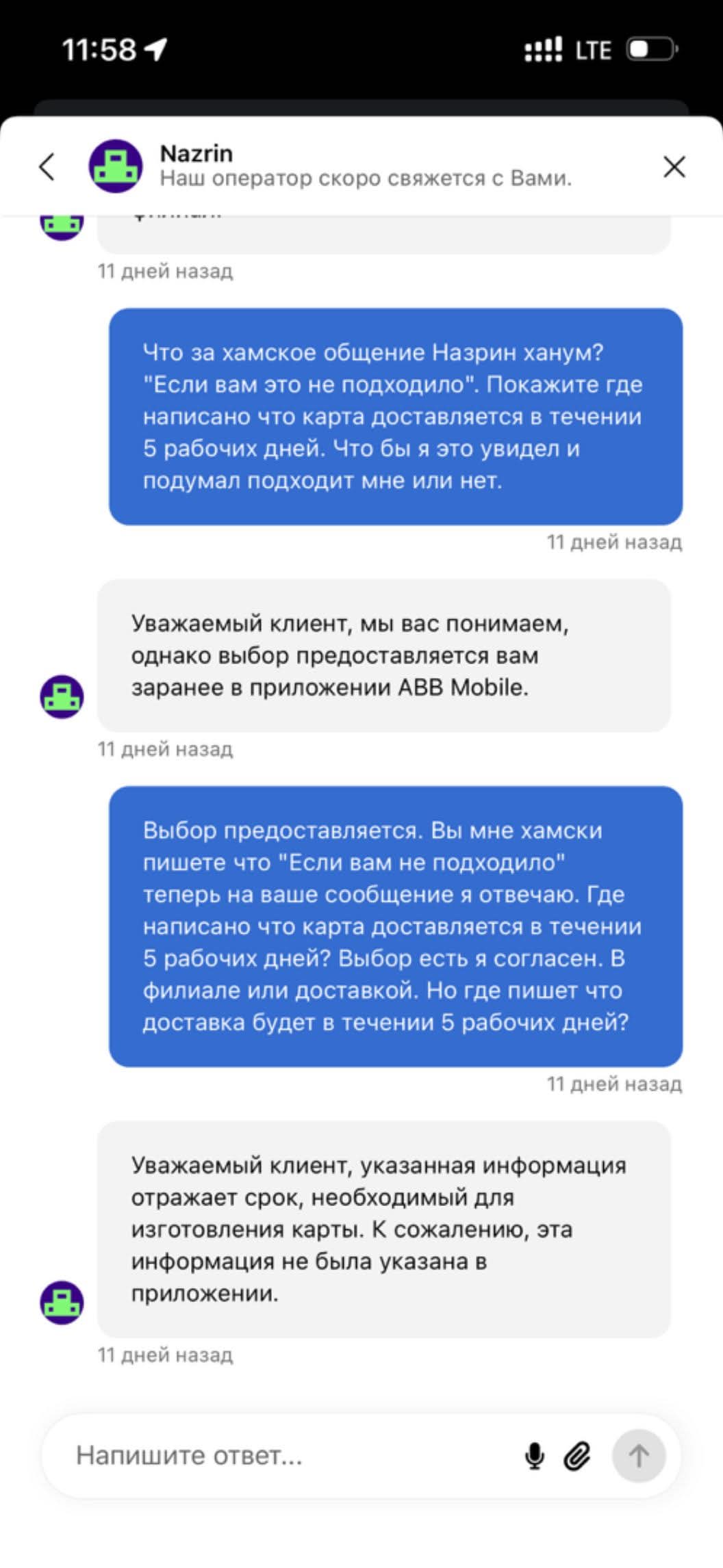 Həmin sorğu ilə bağlı göndərilən bildirişdə icra müddətinin 1 iş günü olduğu qeyd olunub. Amma artıq 27.11.2025 olmasına baxmayaraq, nə cavab verilib, nə də kart çatdırılıb. Operatorlarla əlaqə saxlayanda isə yalnız “qısa zamanda əlaqə saxlanılacaq” deyə cavablandırılır.
