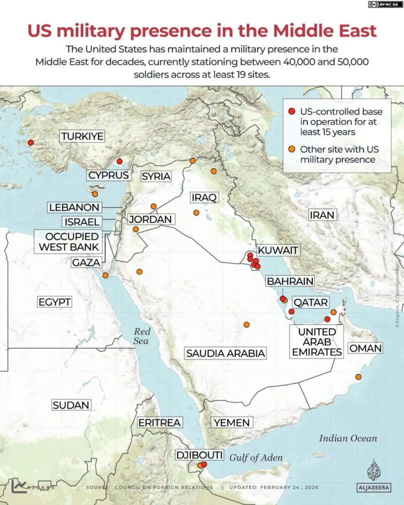 Azpost.info ABŞ-ın Yaxın Şərqdəki hərbi bazalarının xəritəsini təqdim edir.