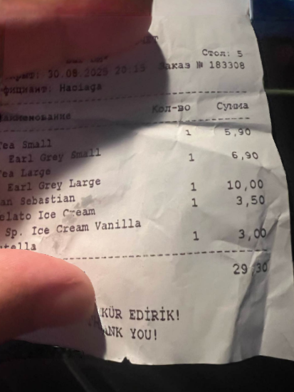 Müştəri hesab edir ki, 2 fincan çay və 2 desert üçün 40 AZN-ə yaxın ödəniş absurd və yersizdir, xüsusilə müştəri əlavə ödəniş barədə xəbərsiz qaldıqda. Onun fikrincə, restoranın belə yanaşması müştəri etibarına xələl gətirir və xidmətdə ciddi çatışmazlıqdır.