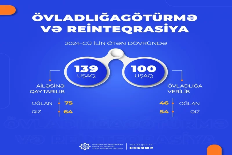 Əmək və Əhalinin Sosial Müdafiəsi Nazirliyinin tabeliyindəki Sosial Xidmətlər Agentliyi tərəfindən 2024-cü ilin ötən dövründə 100 uşaq övladlığa verilib. Onlardan 46 nəfəri oğlan, 54 nəfəri qızdır.