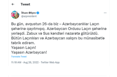 “Avqustun 26-da Laçın şəhərinə qayıtmışıq…Ordu Laçın şəhərinə yerləşdi” – PREZİDENT HAMININ GÖZLƏDİYİ TVİTİ YAZDI 26 Avqust 2022 - 11:29