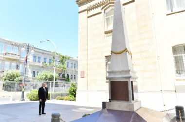 Prezident Azərbaycan Xalq Cümhuriyyətinin şərəfinə ucaldılmış abidəni ziyarət edib 28 May 2022 - 15:21