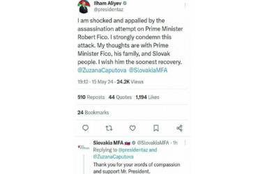Slovakiya XİN Robert Fitso ilə bağlı paylaşımına görə Prezident İlham Əliyevə təşəkkür edib 16 May 2024 - 17:44