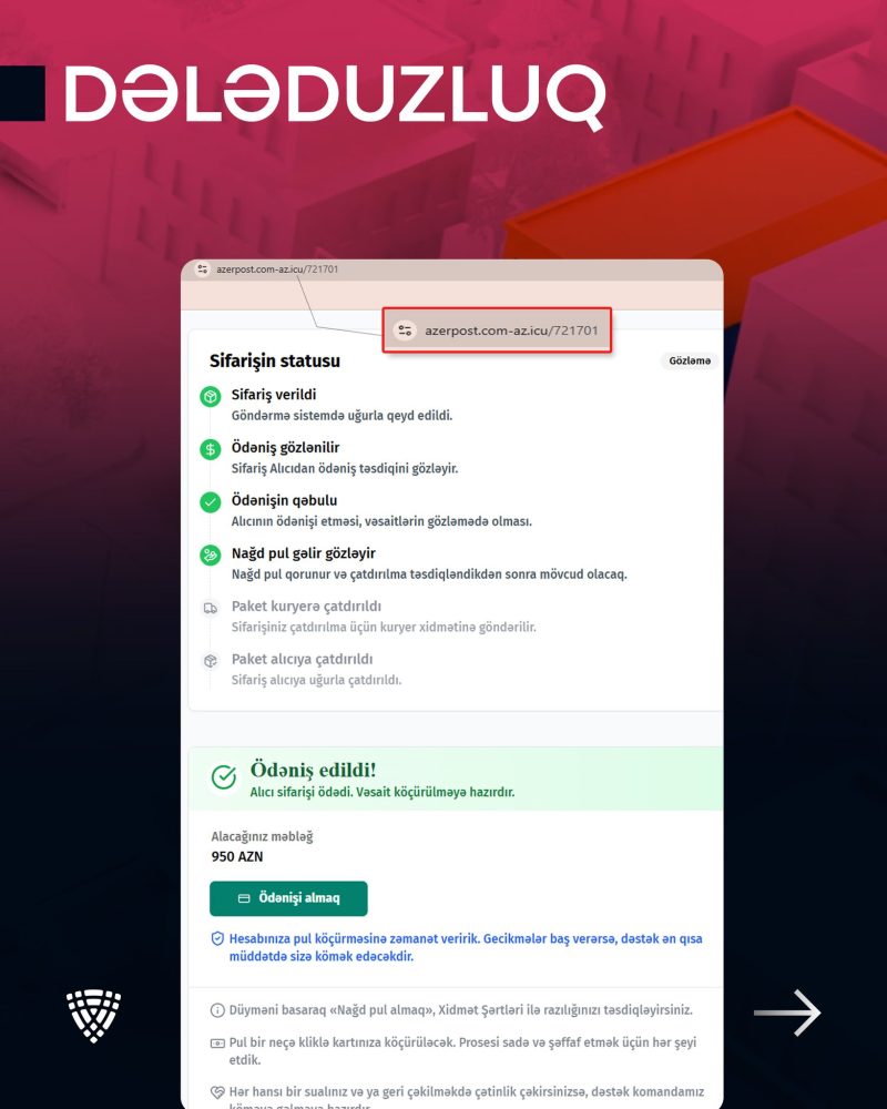 Rəqəmsal İnkişaf və Nəqliyyat Nazirliyinin nəzdində fəaliyyət göstərən Elektron Təhlükəsizlik Xidmətinin (ETX) müşahidələrinə əsasən, son günlər kiberdələduzlar “Azərpoçt” MMC-nin adı və loqosundan sui-istifadə edərək vətəndaşlara qarşı məqsədli fırıldaqçılıq kampaniyası həyata keçirirlər.