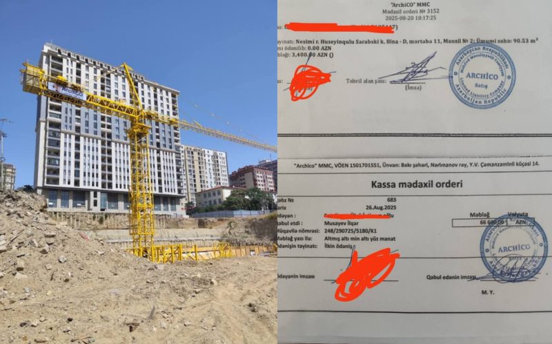AzPost xəbər verir ki, şikayətçinin sözlərinə görə, avqustun 20-də Archico şirkəti ilə 2 otaqlı mənzilin alışı üçün müqavilə imzalanıb. Müqavilədə 1 kvadratmetrin qiyməti 3000 manat olaraq göstərilib və vətəndaş ilkin ödəniş kimi 70 min manat məbləğində vəsait şirkətə təqdim edib. Müqavilənin üzərində şirkətin möhürü də olub.