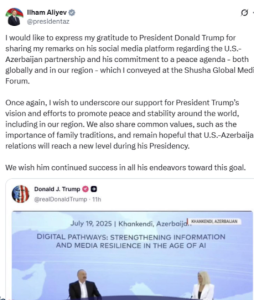 Azərbaycan dövlət başçısı İlham Əliyev ABŞ Prezidenti Donald Trampa öz sosial şəbəkəsində onun Şuşa Qlobal Media Forumundakı çıxışını paylaşdığına görə təşəkkür edib.