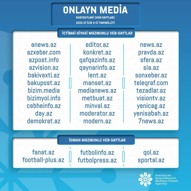 Azərbaycan Respublikasının Medianın İnkişafı Agentliyi tərəfindən onlayn media subyektlərinə (veb-saytlara) dəstək layihəsi çərçivəsində elan edilmiş müsabiqənin nəticələrini açıqlayıb.