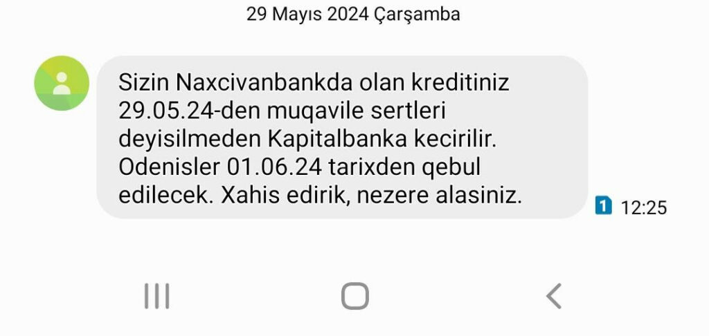 Sms-də qeyd edilib ki, “Naxçıvan Bank” ASC-də kredit ödənişləri olan vətəndaşların kreditləri bu gündən etibarən müqavilə şərtləri dəyişdirilmədən “Kapitalbank” ASC-yə keçirilir. Kredit ödənişləri 01.06.2004-cü il tarixdən qəbul ediləcək.