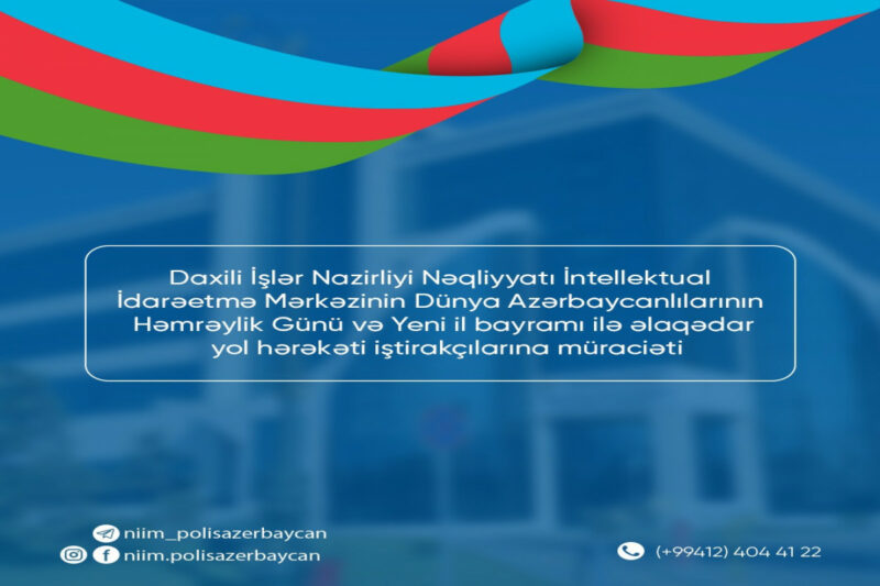 Daxili İşlər Nazirliyi Nəqliyyatı İntellektual İdarəetmə Mərkəzi Dünya Azərbaycanlılarının Həmrəylik Günü və Yeni il bayramı ilə əlaqədar yol hərəkəti iştirakçılarına müraciət edib.