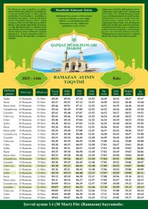 Hər il olduğu kimi, bu il də Qafqaz Müsəlmanları İdarəsi mübarək Ramazan ayının gündəlik duaları, imsak-iftar vaxtlarını əks etdirən xüsusi təqvim tərtib edib. Bu təqvim İdarəmizin internet saytında (www.qafqazislam.com) yerləşdirilib. Əhalimizin və bütün kütləvi informasiya vasitələrinin məhz QMİ-nin təqviminə istinad etmələri tövsiyə olunur. İnşallah, Qafqaz Müsəlmanları İdarəsi Şamaxı Astrofizika Rəsədxanasının məlumatına əsaslanaraq Eydül-Fitr – Ramazan bayramının hilalın görünüşünə görə 30 Mart tarixinə təsadüf edəcəyini bildirir, müəyyən dəyişikliklər olacağı təqdirdə əlahiddə məlumat veriləcəkdir.