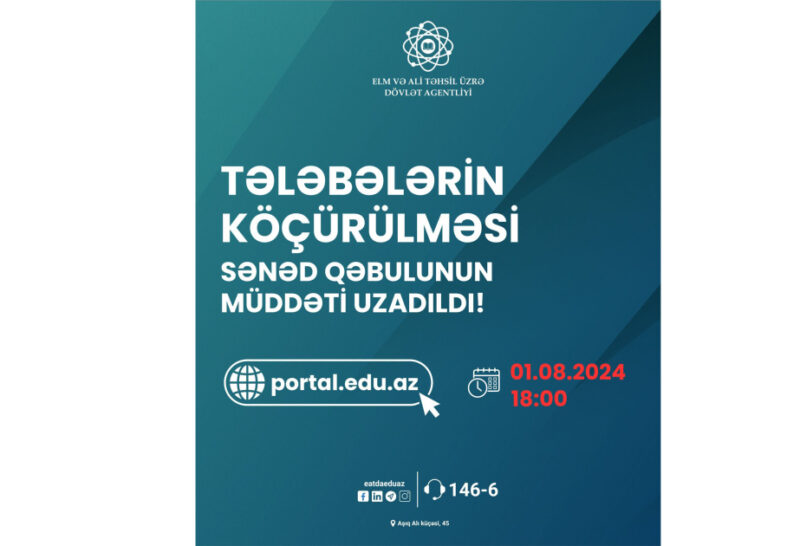 Elm və Ali Təhsil üzrə Dövlət Agentliyindən bildirilib ki, həmin tarixədək təhsil müəssisəsini, ixtisasını və ya təhsilalma formasını dəyişmək istəyən tələbələr portalda qeydiyyatdan keçərək şəxsi kabinet yaratdıqdan sonra, istifadəçi adı və şifrədən istifadə etməklə “Ali və orta ixtisas təhsili pilləsində təhsilalanların köçürülməsi” xidmətinə daxil olub, köçürülmək üçün elektron müraciət formasını doldurub təsdiq edə bilərlər.