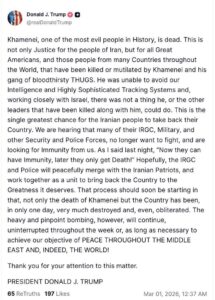 Bu, İran xalqının ölkələrini geri almaq üçün ən böyük şansdır. Eşidirik ki, onların SEPAH, ordusu və digər təhlükəsizlik və polis qüvvələrində bir çoxları artıq döyüşmək istəmir və bizdən toxunulmazlıq gözləyirlər. Ümid edirəm ki, SEPAH və polis İran vətənpərvərləri ilə sülh yolu ilə birləşəcək və ölkəni layiq olduğu böyüklüyə qaytarmaq üçün birlikdə çalışacaqlar. Bu proses tezliklə başlamalıdır”-deyə Tramp yazıb.