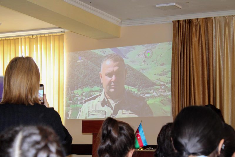 Görüşdə şagirdlərə qəhrəman zabitin döyüş yolu və həyat hekayəsi barədə geniş məlumat verilib.